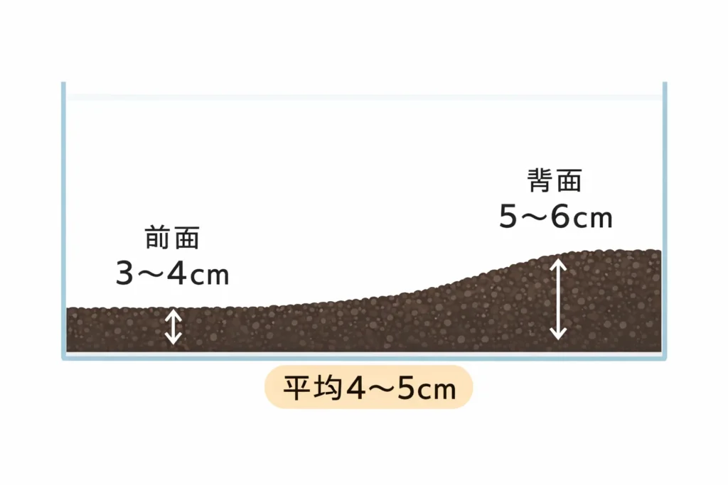 薄敷き・厚敷き、底面フィルター/スポンジフィルターでの厚さの決め方は別記事で詳しく解説しています。