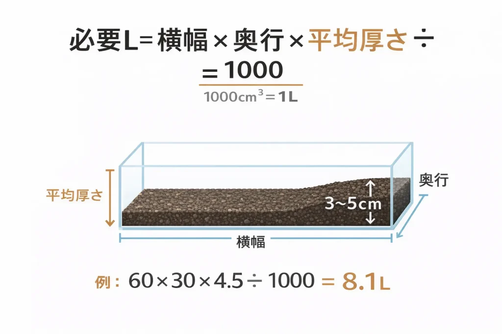 迷ったら前面3〜4cm/背面5〜6cm(平均4〜5cm)を基準にして、まず必要量(L)を計算します。